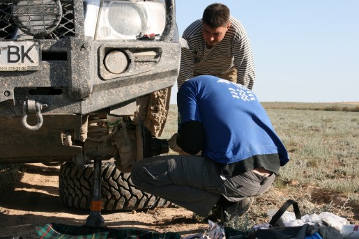 Как оказалось, движение по степи — дело не простое. По началу отличная грунтовка позволяет разогнаться до скорости более 100км/ч. И вдруг, неожиданно, эту отличную дорогу пересекает поперечная колея — вытормаживаемся в пол, удар и опять 100км/ч. И так до бесконечности.