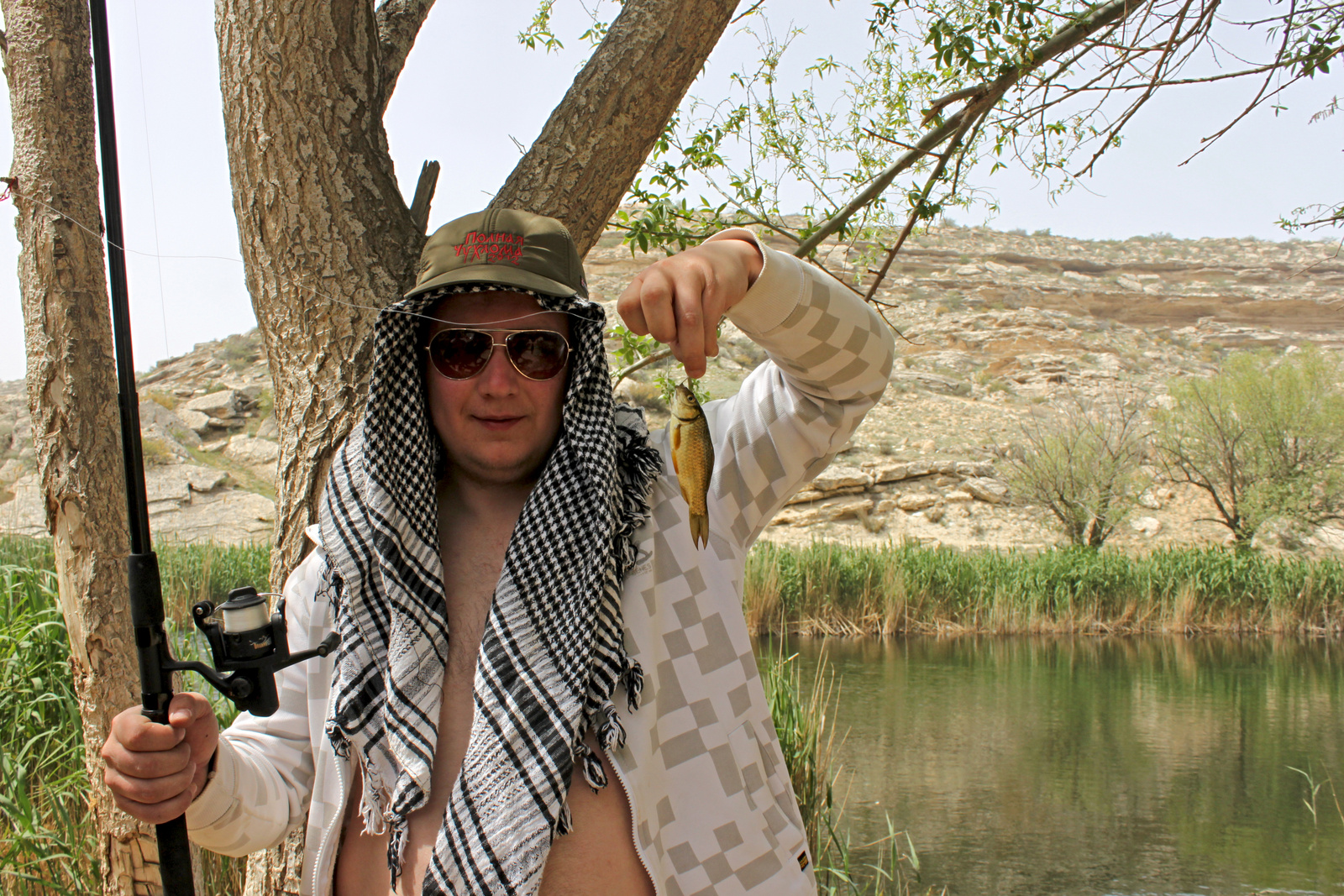 Пресная вода в этом роднике сочится со скального уступа и падает струями с высоты трех метров. Вода из капель собирается в небольшой ручей, который впадает в рукотворное озеро, окруженное камышом и редкими деревцами. В этом озере нам чудом удалось наловить целую банку небольших желтых карасей!